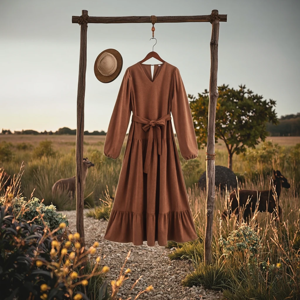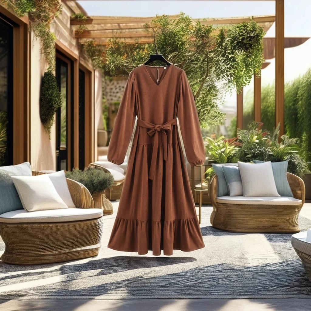 Casual Women's Brown Maxi Dress V Neck Long Sleeve Sashes Breathable Woven Natural Waist XS Size for Spring Summer Autumn Solid